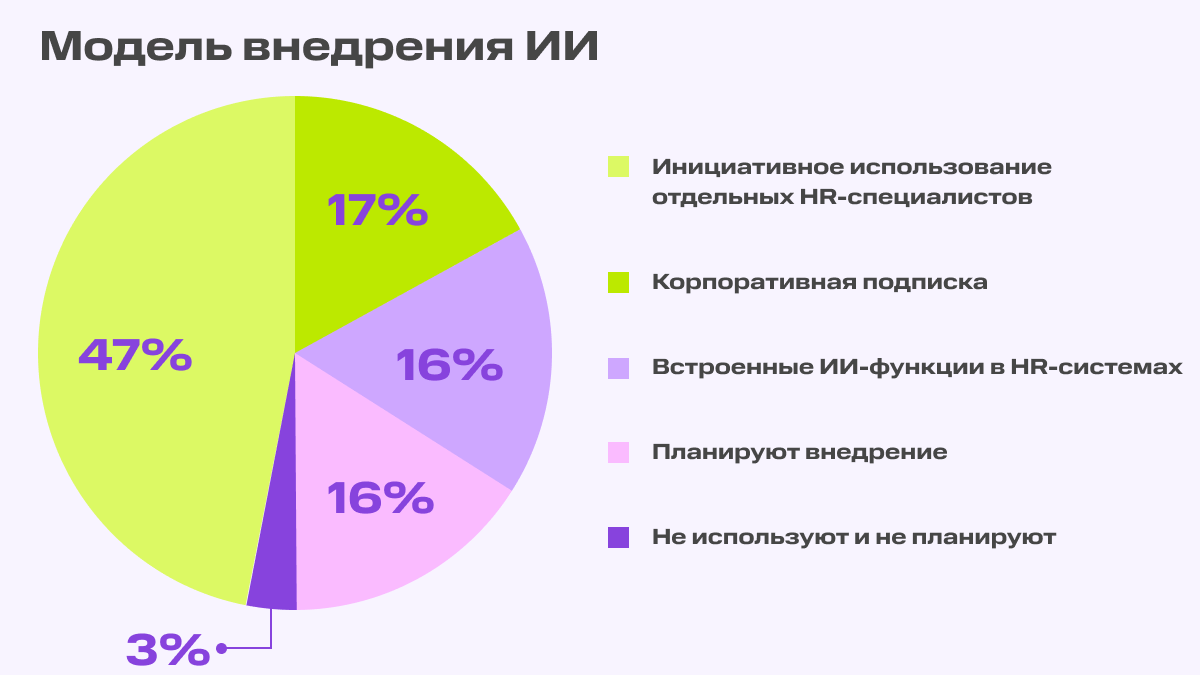 По данным опроса, 97% респондентов уже применяют ИИ в работе либо планируют это сделать в перспективе одного–двух лет. Однако в большинстве компаний технологии появляются не как часть общей стратегии, а по инициативе отдельных HR-специалистов. Лишь около трети участников исследования сообщили, что ИИ внедряется централизованно, через корпоративные подписки или встроенные решения в HR-системах.