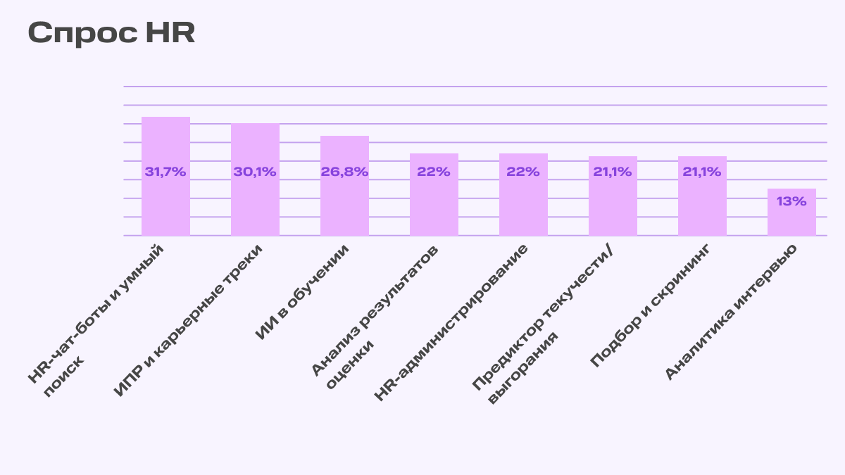 Пока бизнес выбирает самые безопасные сценарии. Чаще всего ИИ используют для подбора персонала и первичного отбора резюме (28%), а также в корпоративном обучении (23%). При этом ожидания заметно опережают реальную практику. HR-специалисты хотели бы активнее применять чат-ботов и интеллектуальный поиск, автоматизировать построение карьерных траекторий и индивидуальных планов развития, а также шире использовать ИИ в обучении — но такие инструменты пока внедрены далеко не везде.