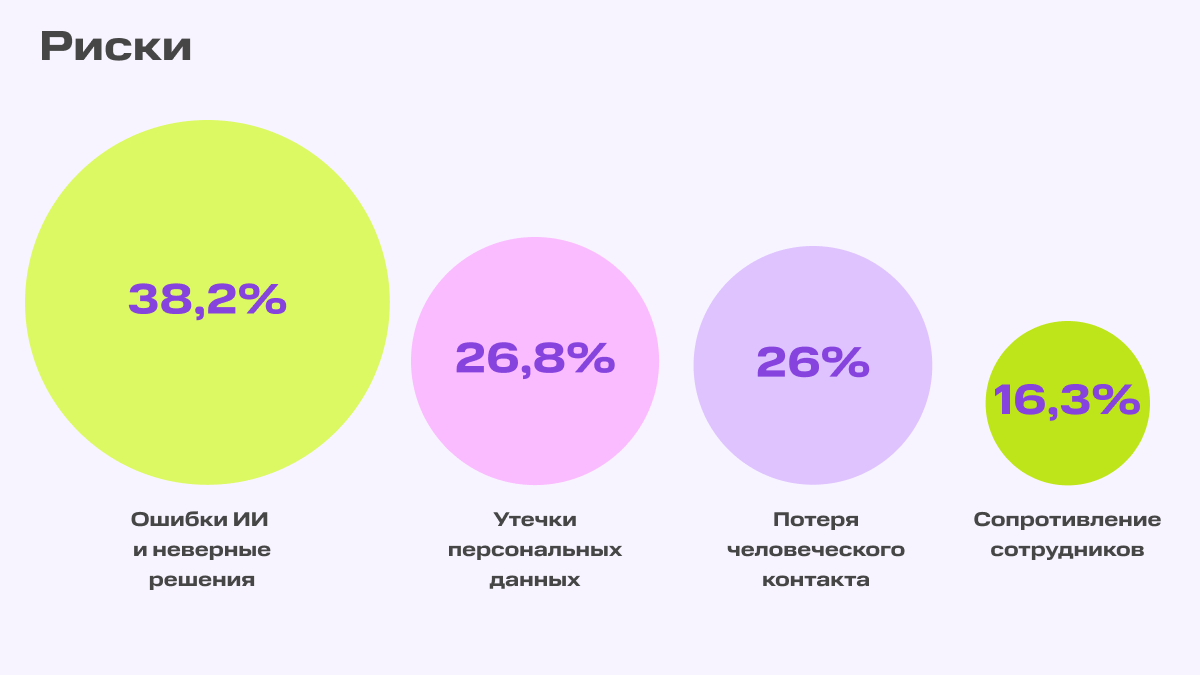 Главное ограничение — не технологии, а доверие. 38% опрошенных опасаются кадровых ошибок из-за некорректных рекомендаций ИИ. Еще 27% называют среди рисков безопасность персональных данных, а 26% — утрату человеческого контакта в работе с сотрудниками. В целом участники исследования сходятся в том, что роль ИИ должна сводиться к анализу и рекомендациям, а ответственность и финальные решения — оставаться за человеком.