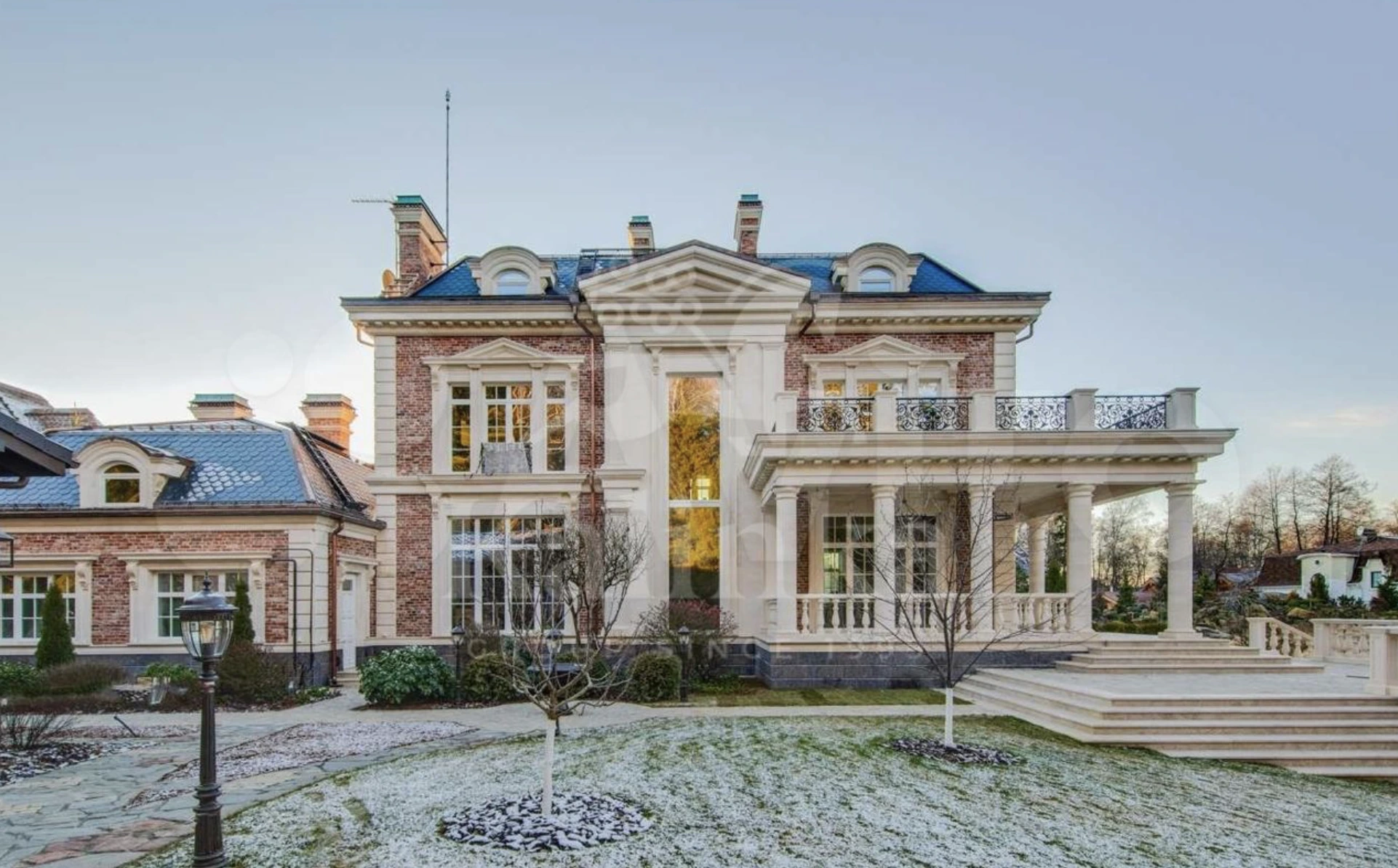Подборку открывает загородная резиденция в Новоглаголево площадью 700 кв. м, выставленная на продажу за 370 млн руб. Согласно описанию, кирпичный дом выполнен в георгианском стиле — с симметричным фасадом и классическими архитектурными деталями, характерными для особняков из рождественских фильмов. Внутри — свободная планировка без отделки, позволяющая организовать просторные гостиные и несколько спален. На участке также расположены охотничий дом с сауной площадью 200 кв. м, дом для персонала и искусственный водоем глубиной до трех метров. Часть территории занимает вековой сосново-еловый лес.