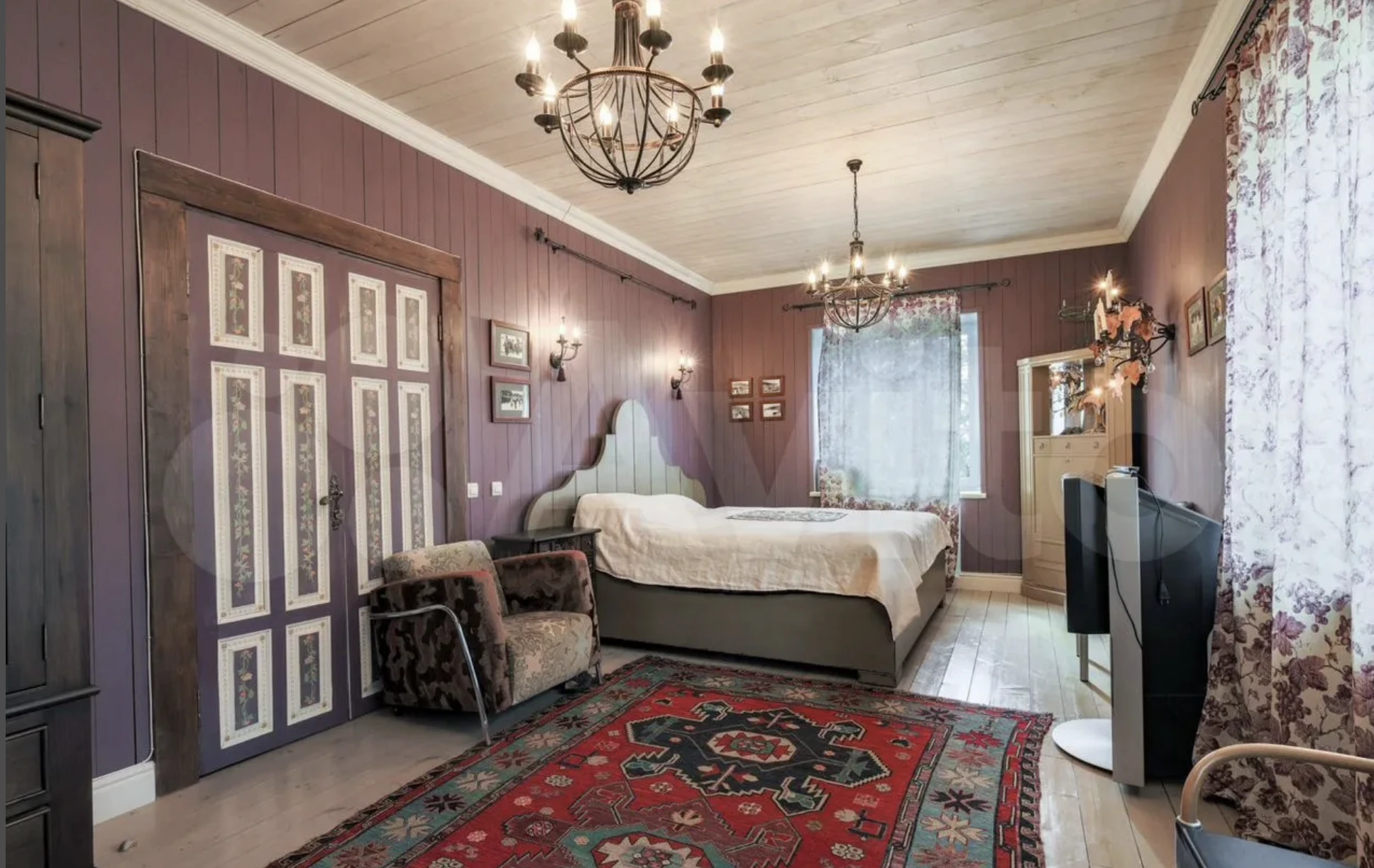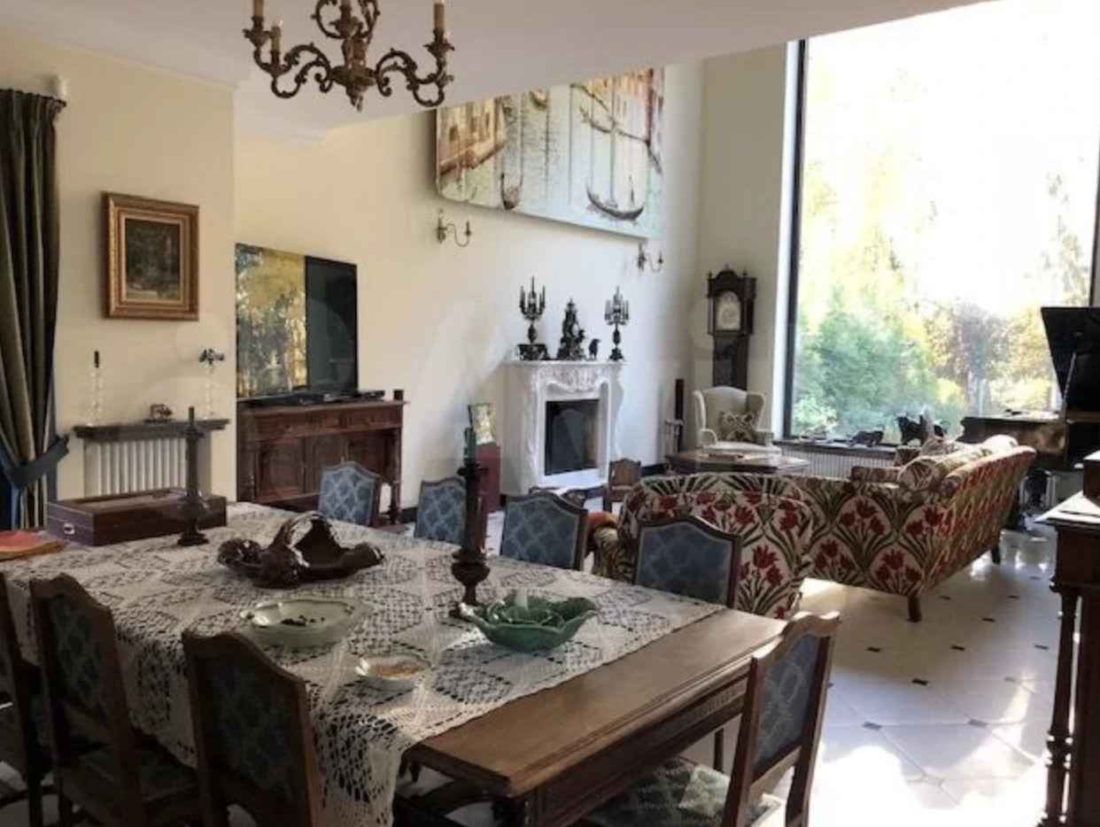 Следующий объект — трехэтажный дом в Одинцовском городском округе площадью 570 кв. м за 62 млн руб. Кирпичный дом с косметическим ремонтом выделяется классической архитектурой и парадными интерьерами. Высокие потолки, винтажные двери и декоративные элементы в гостиной и столовой формируют образ большого семейного дома. В планировке предусмотрен винный погреб с дегустационным залом, гараж в периметре здания и участок площадью 15 соток, расположенный в тупике с респектабельным окружением.