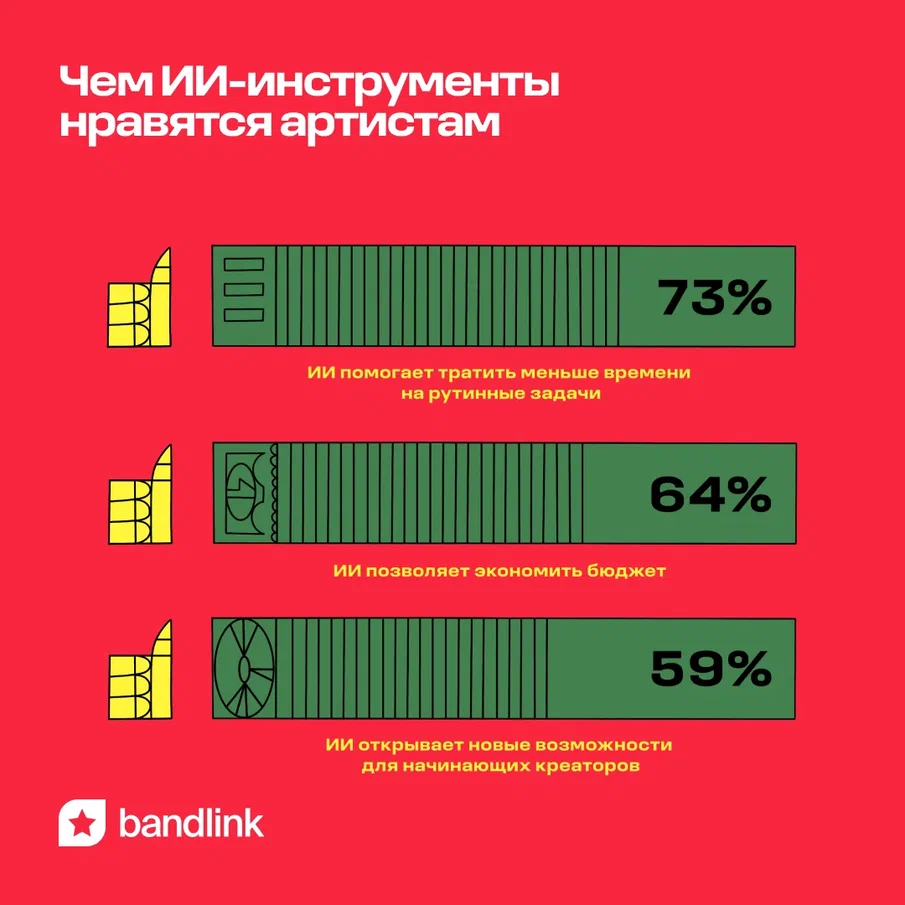 Сервис BandLink (входит в «Яндекс») провел исследование о том, как музыканты используют искусственный интеллект. Данные показывают: ИИ стал частью повседневной работы двух третей профессиональных артистов. При этом отношение к технологиям остается сдержанным — 72% воспринимают ИИ положительно или нейтрально, а 28% — отрицательно. Подробности — в распоряжении «Инка».