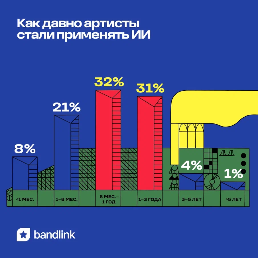 Интерес к инструментам растет стремительно. 61% артистов начали пользоваться ИИ в течение последнего года, а 8% — за месяц до опроса. Это говорит о быстром распространении технологий даже в творческой профессиональной среде.