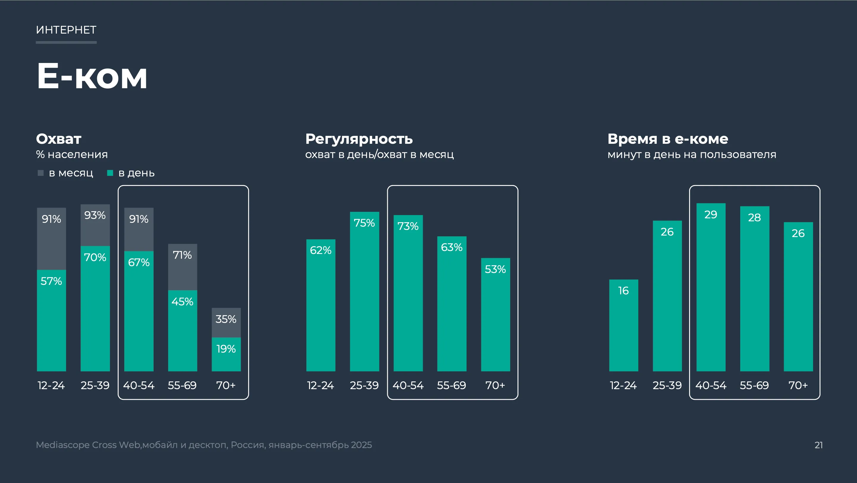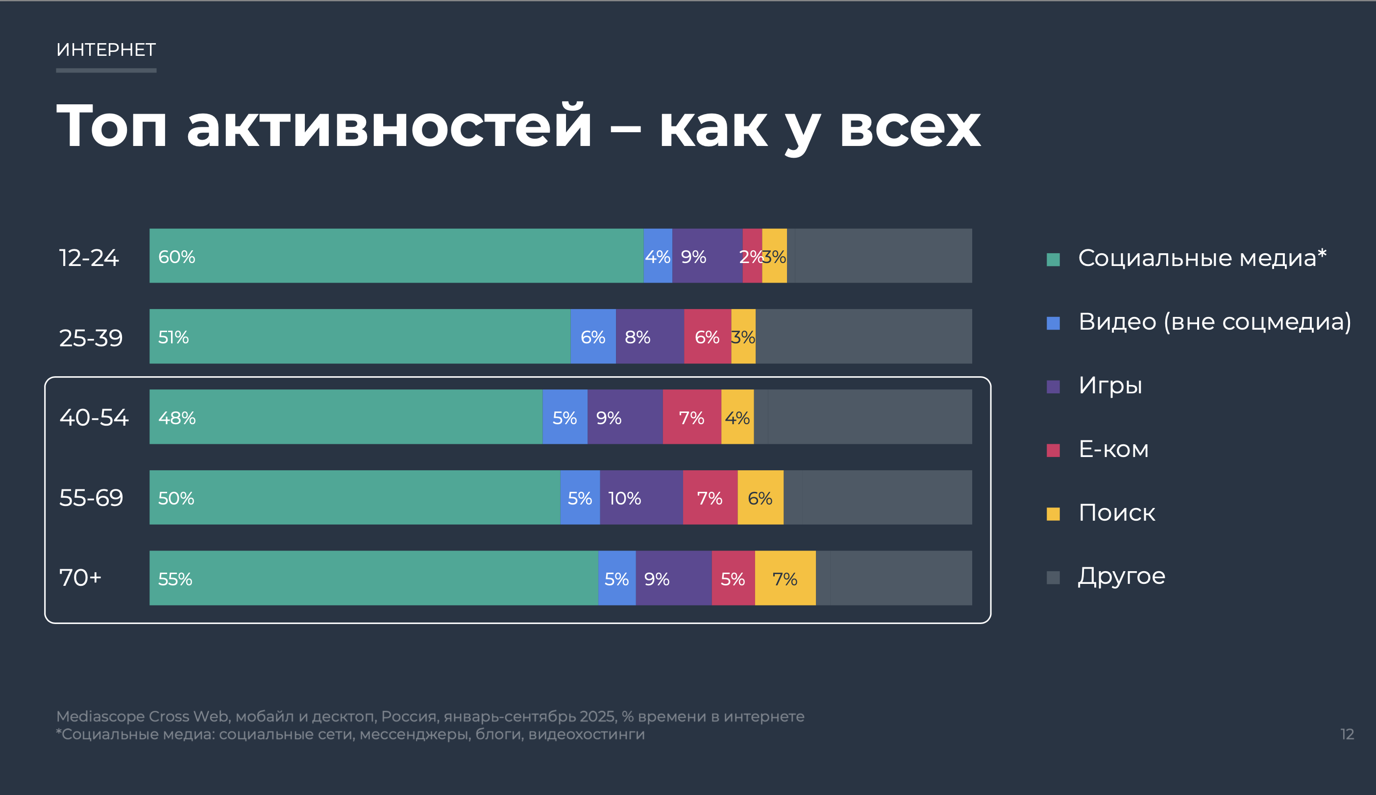 Россияне от 55 до 69 лет половину времени в интернете сидят в социальных медиа, а пользователи 70+ даже больше половины — 55%. Пользователи старше 40 лет тратят большую часть своего времени в сети на социальные сети (48–55%), просмотр видео, игры и онлайн-шопинг.