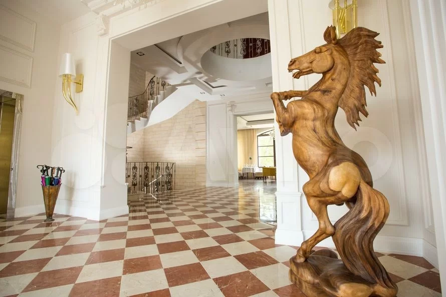 На Рублево-Успенском шоссе, в деревне Солослово, продается трехэтажный дом площадью 2000 кв. м за 1,2 млрд руб. В описании указана планировка с кухней, столовой, мягкой зоной, прихожей с гардеробом и санузлом, бассейном, душевыми и хамамом. В доме предусмотрены девять спален с собственными санузлами и гардеробными, спортзал, прачечная и зоны отдыха. Круговой подъезд, панорамные окна, протяженные террасы и винтовая лестница под куполом с люстрой задают визуальный ритм пространству. На участке также находится отдельное здание с залом и кухней, мангальная зона и озеленение взрослыми деревьями.
