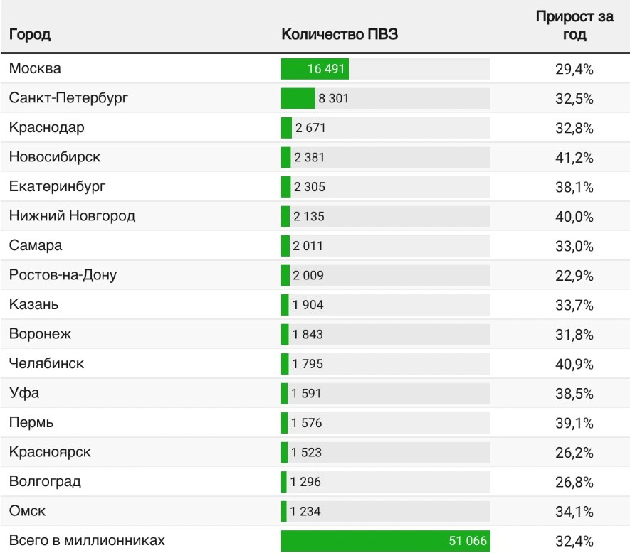 Наиболее значительный рост зафиксирован в Новосибирске, где число ПВЗ выросло на 41,2% (с 1,6 до 2,4 тыс.). Челябинск и Нижний Новгород показали схожие темпы прироста — около 40%.