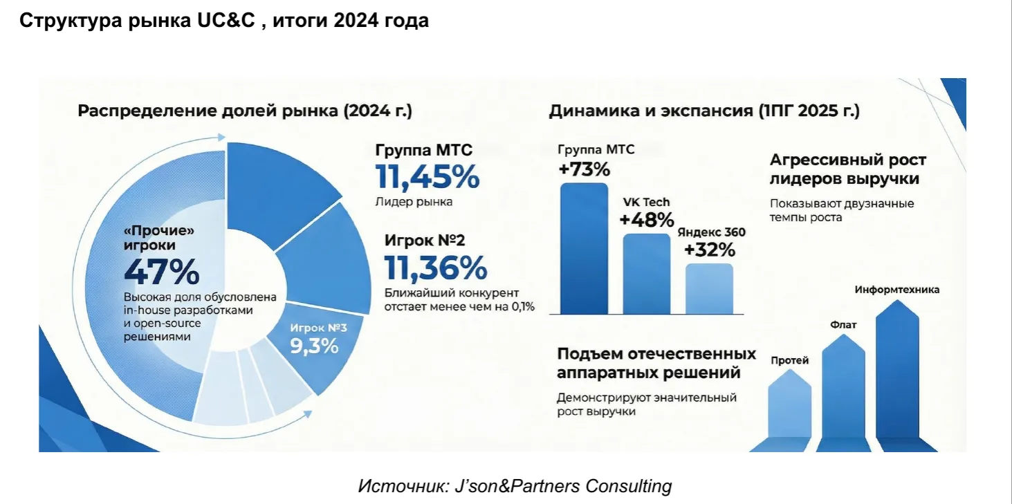 В ход идут как собственная разработка, так и сделки M&A. Например:— МТС усилила позиции за счет интеграции Webinar и Vinteo,— «Ростелеком» развивает направление через приобретение решений вроде «Манго».