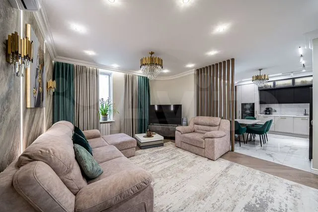 Первый вариант в этом районе — 3-комнатная квартира 100 кв. м за 99 млн руб.: дизайнерский ремонт, умный дом, мастер-спальня с отдельным санузлом и гардеробной. Рядом — парки и благоустроенные дворы.