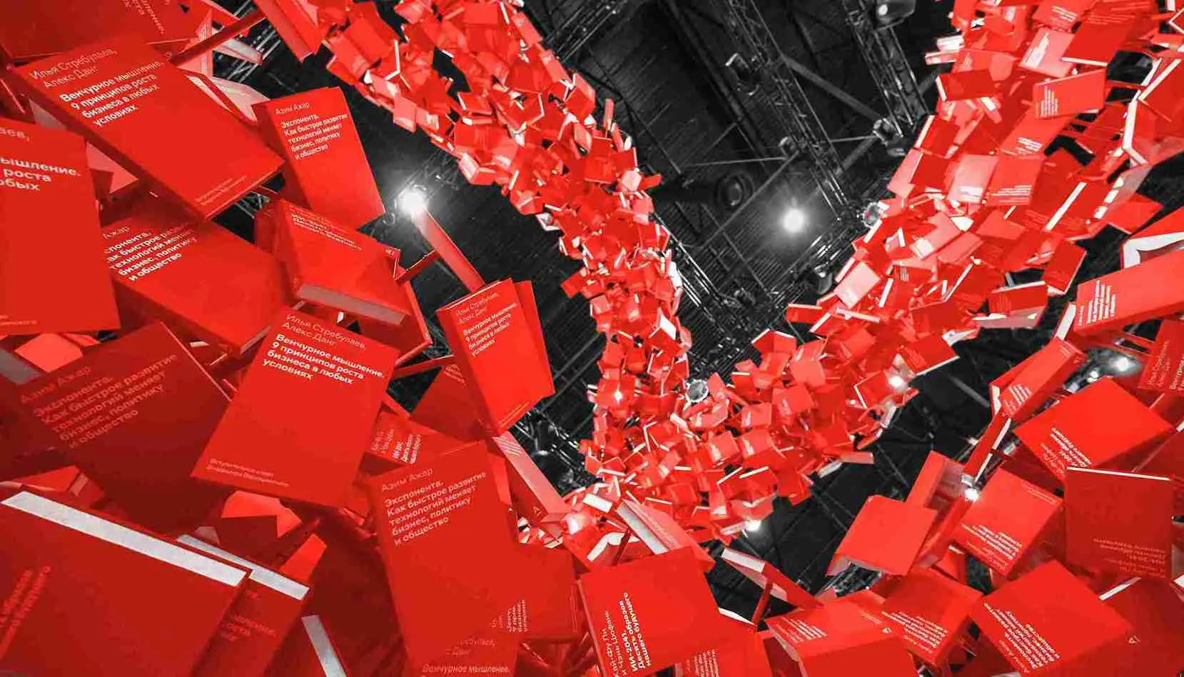 Арт-объект в виде вихря из 18 тыс. красных книг на стенде Альфа-банка. Он символизирует движение идей, их круговорот и мощь, порождающую технологии будущего.