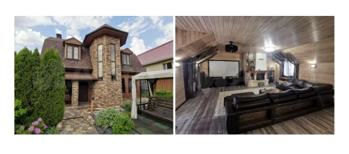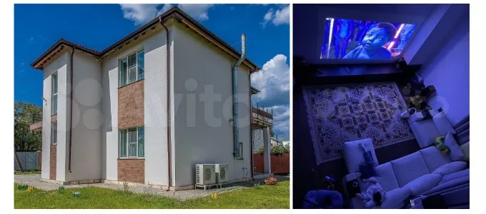 Двухэтажный дом площадью 203,5 кв. м оценен в 20,7 млн руб. Выполнен дизайнерский ремонт, установлены панорамные окна и дровяной камин. Планировка включает детскую игровую, кабинет и три спальни. Гостиная оборудована проектором для просмотра фильмов на большом экране. Территория располагает парковкой на четыре автомобиля, зоной отдыха и электрическими воротами с дистанционным управлением.