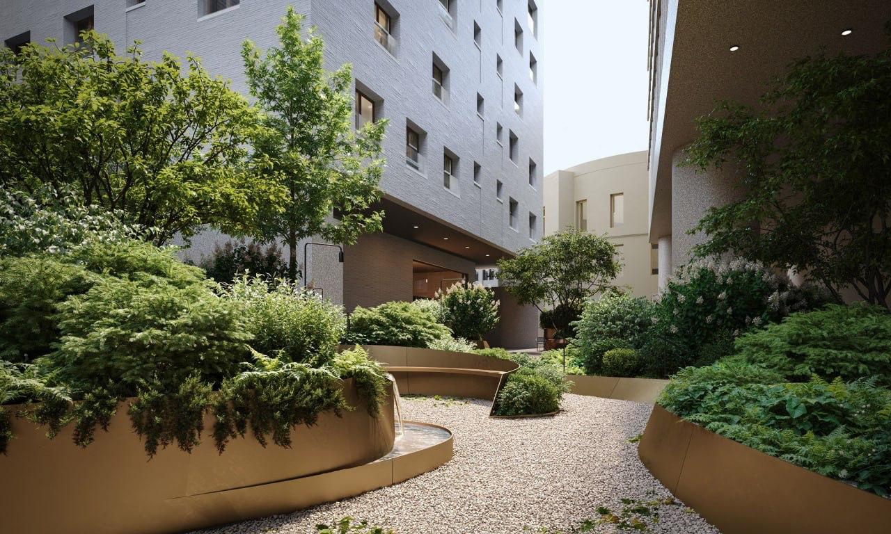 Внутренний двор комплекса площадью 3,2 тыс. кв. м включает общественную зону с палатами Тверского подворья, прогулочными дорожками и детской площадкой, а также приватную зону только для резидентов — с сенсорным садом, фонтаном и амфитеатром. Концепцию благоустройства разработало бюро SCAPE.