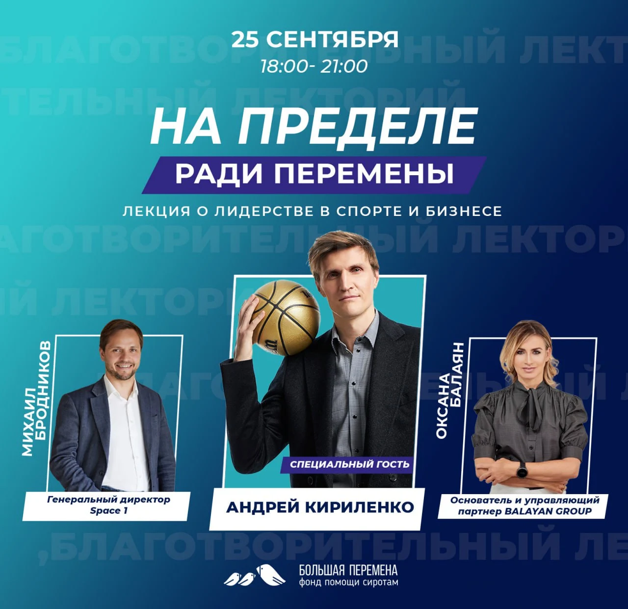 25 сентября в Москве пройдет лекция-дискуссия «На пределе ради перемены. Лидерство, закаленное в спорте и бизнесе», организованная фондом «Большая перемена», юридической фирмой Balayan Group и сетью сервисных офисов Space 1. Мероприятие объединит лидеров спорта и бизнеса, чтобы показать, как закалка на беговой дорожке помогает принимать управленческие решения и не бояться вызовов.
