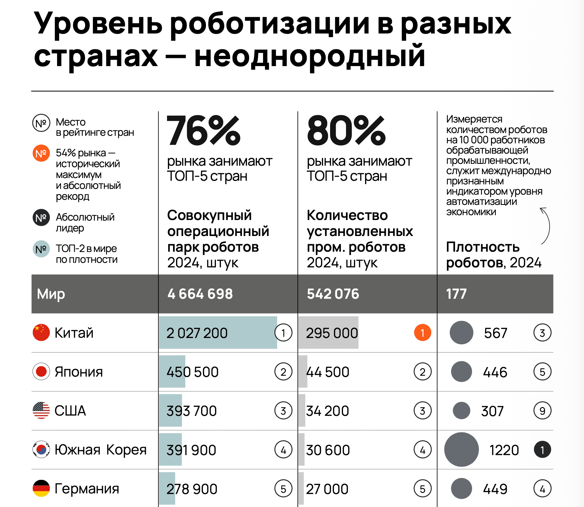 — Безусловным лидером остается Китай: больше 2 млн роботов в парке, кратно опережает всех по ежегодному объему установок. Но по плотности роботов китайцы лишь третьи. Впереди Южная Корея и Сингапур, хотя тут как раз работает то самое искажение, о котором я говорила.