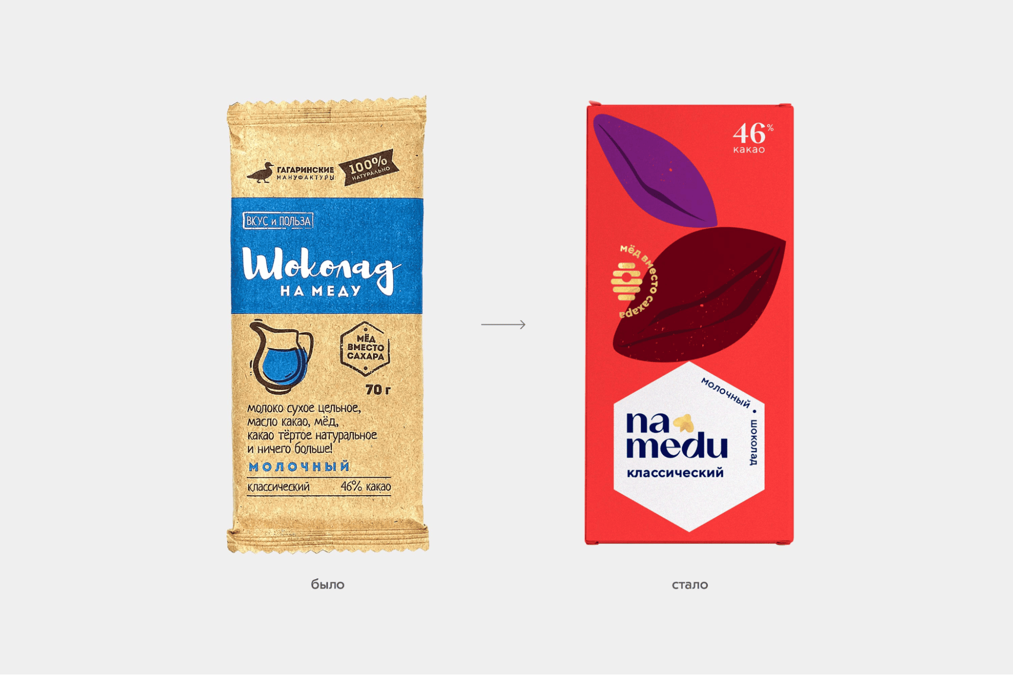 В одном из наших проектов мы работали с брендом шоколада Namedu. Клиент стремился к современному минимализму и хотел полностью отказаться от крафтовой упаковки, которая долгие годы оставалась важным элементом узнаваемости продукта. Мы разработали лаконичный, яркий дизайн, продукт вышел на рынок, но после запуска стало ясно, что покупатели перестали узнавать его на полке.