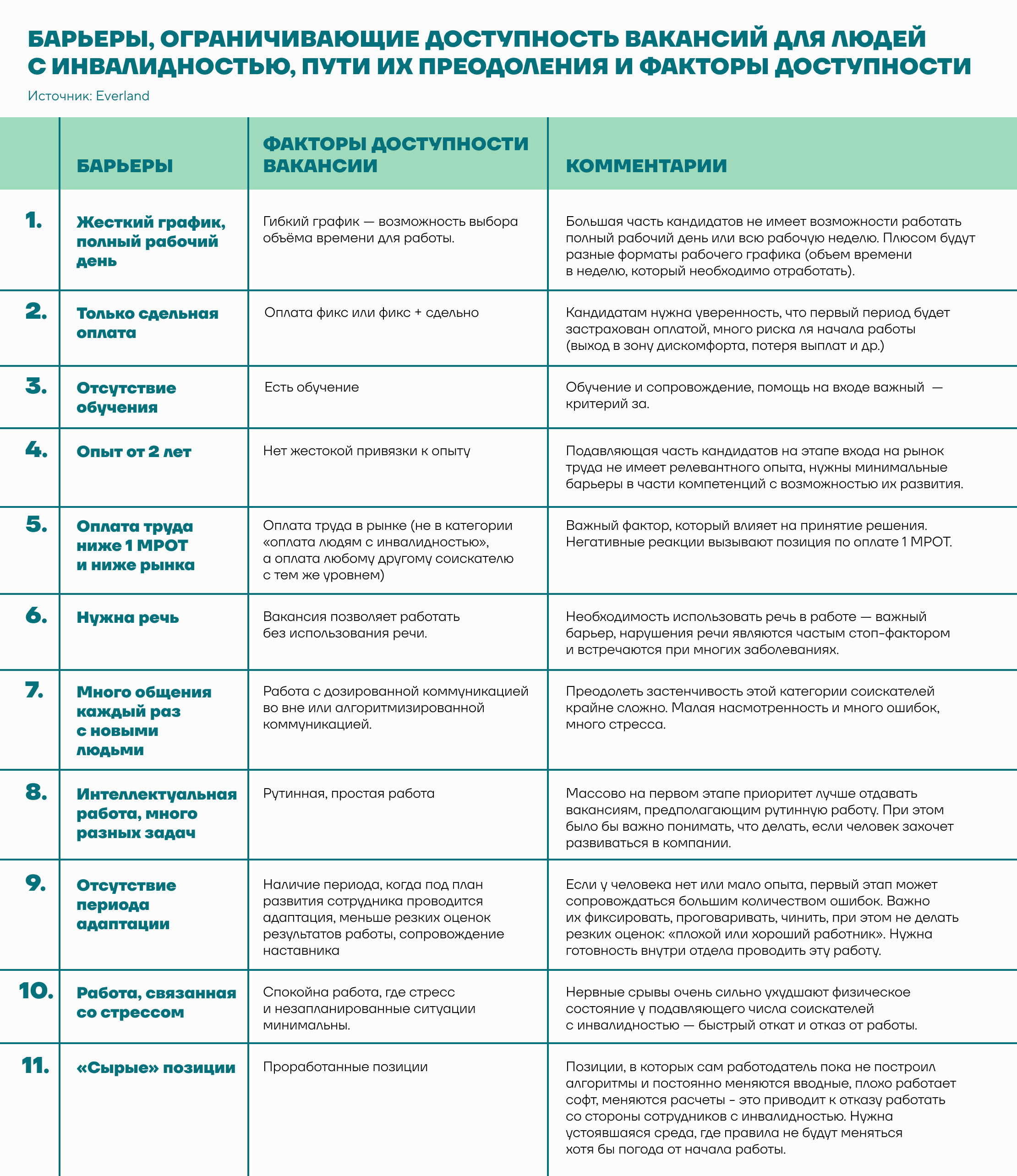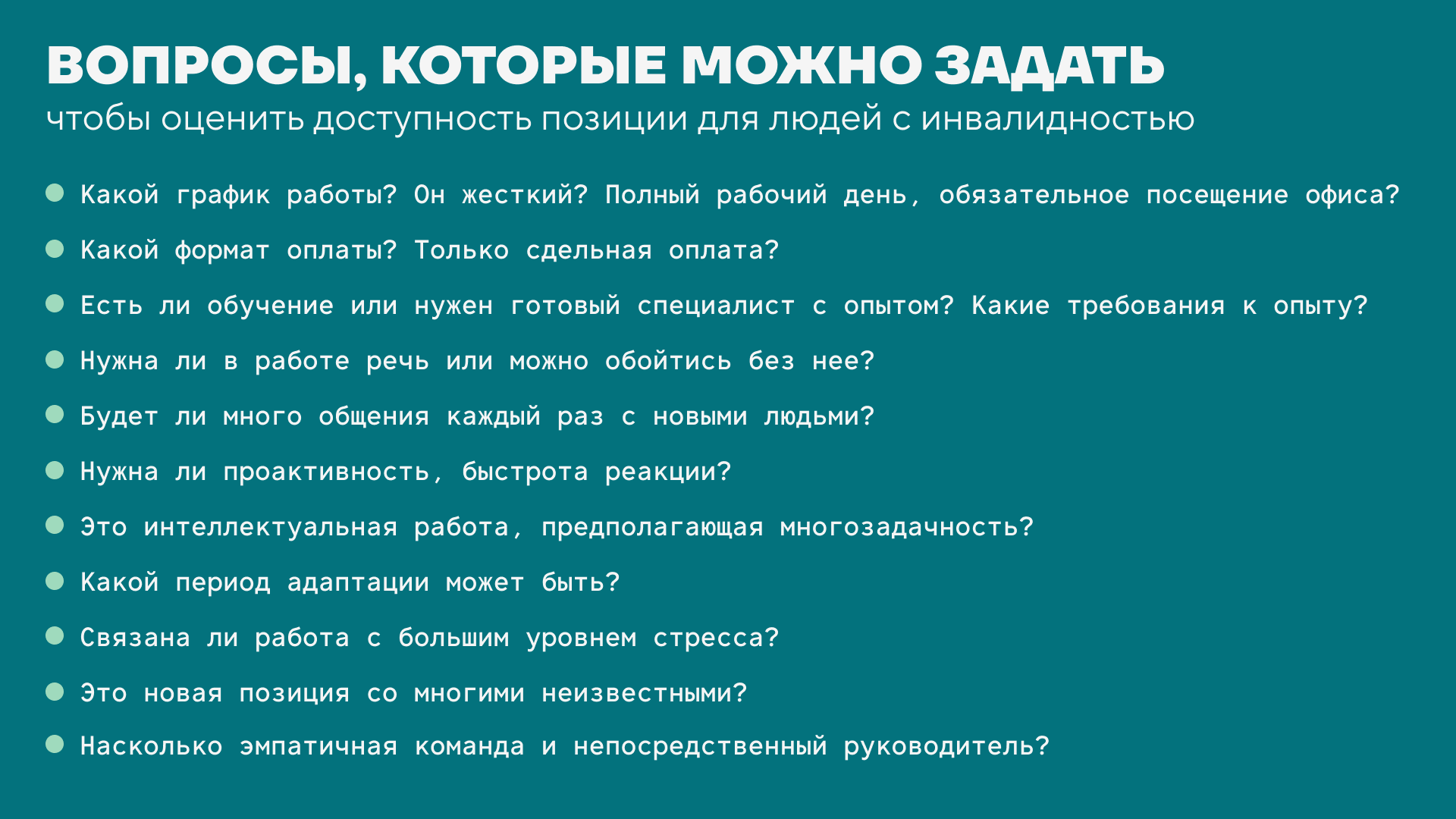 Чтобы это понять, нанимающему персоналу нужно разработать список контрольных вопросов, которые позволят оценить доступность вакансии для кандидатов с инвалидностью. Список таких вопросов зависит от бизнес-процессов компании и особенностей соискателей.