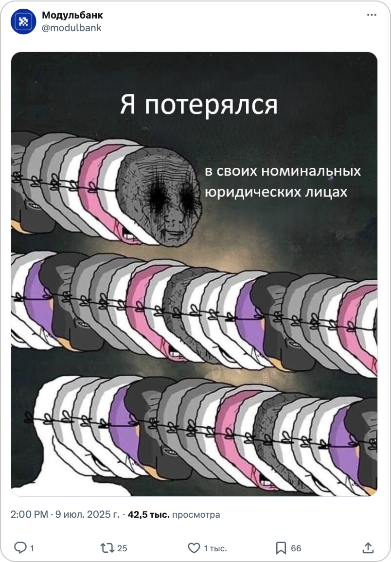 Уже больше полутора лет мы ведем аккаунт «Модульбанка» в X (бывший Twitter) и делаем рилсы для Instagram*. Клиент пришел к нам в 2023 году с задачей повысить узнаваемость среди предпринимателей, чей бизнес уже пережил кризисы первых трех-пяти лет и остался на плаву. Для банка это самый платежеспособный сегмент аудитории. Команда заказчика провела глубинное исследование среди нескольких тысяч предпринимателей, из которого мы узнали, что они очень одиноки в своих проблемах. Все рекламные кампании построены на образе бизнесмена-героя, а российский предприниматель редко чувствует себя таким.