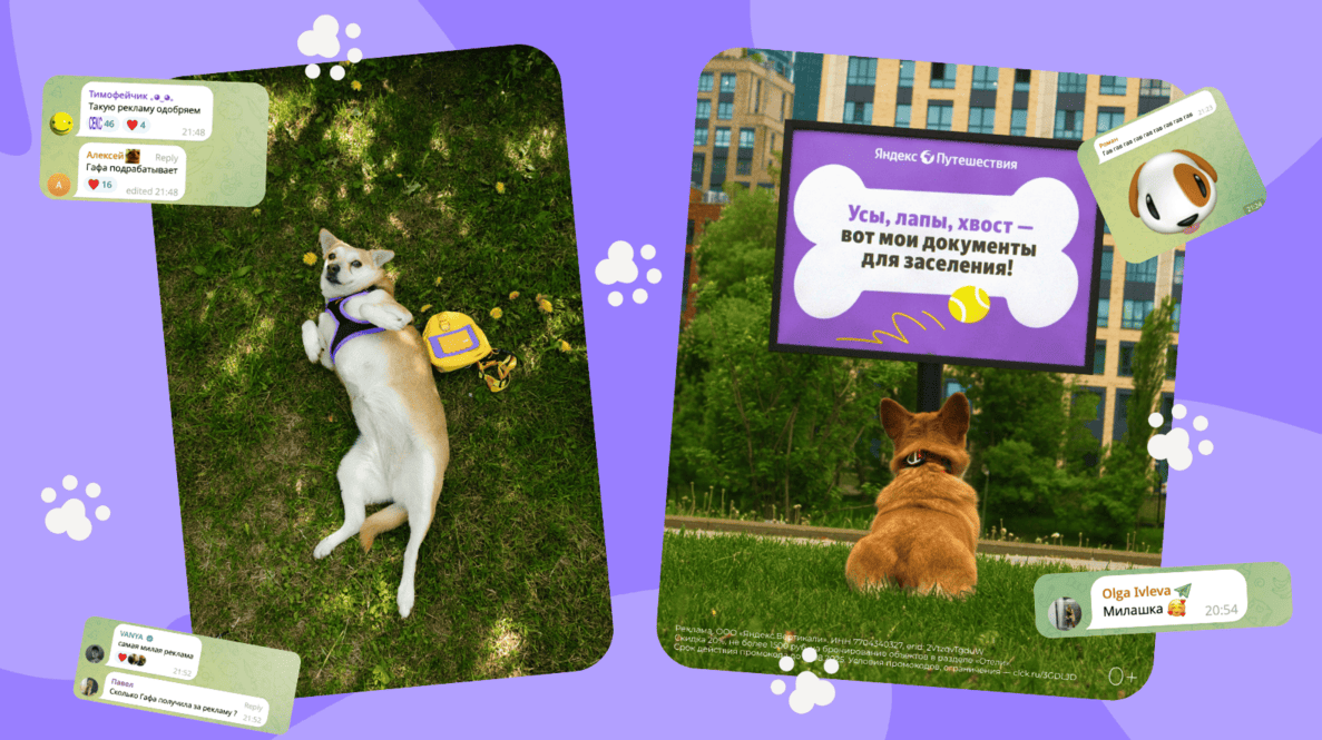 Не всем и не всегда нужны трендовые шутки — иногда лучше взять что-то вечное. Например, недавно мы проводили рекламную кампанию для «Яндекс Путешествий», главными героями которой были собачки. Cделали смешные фото с ними, будто они отправляют селфи из отпуска, а текст посева для соцсетей заменили на бесконечное «гав-гав». Это был чит-код. Все любят собачек, поэтому компания прошла на ура: с охватом в 2,7 млн, что на 36% больше планируемого, и финальным CPV в 0,7 руб. И не пришлось гнаться за сиюминутным трендом.