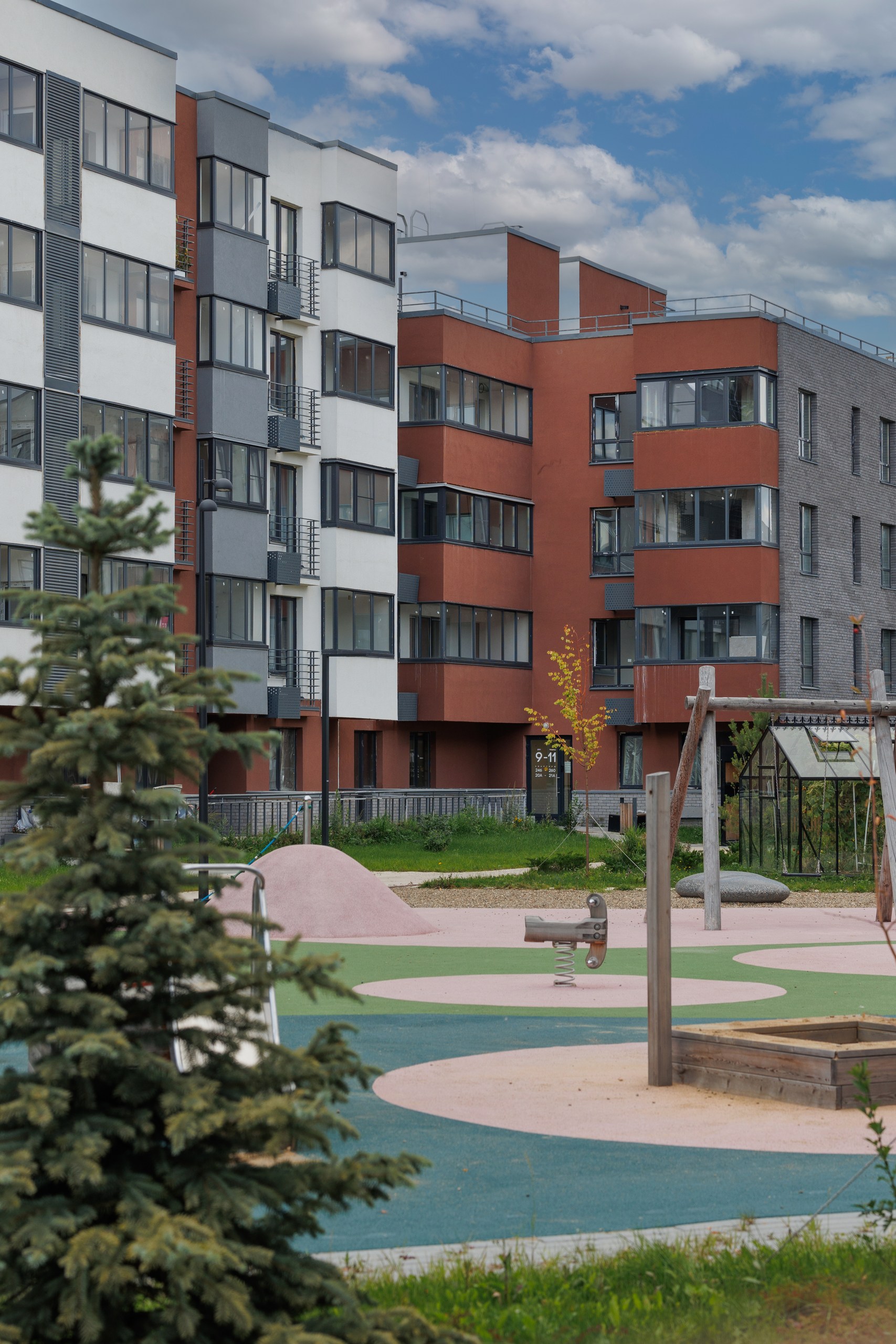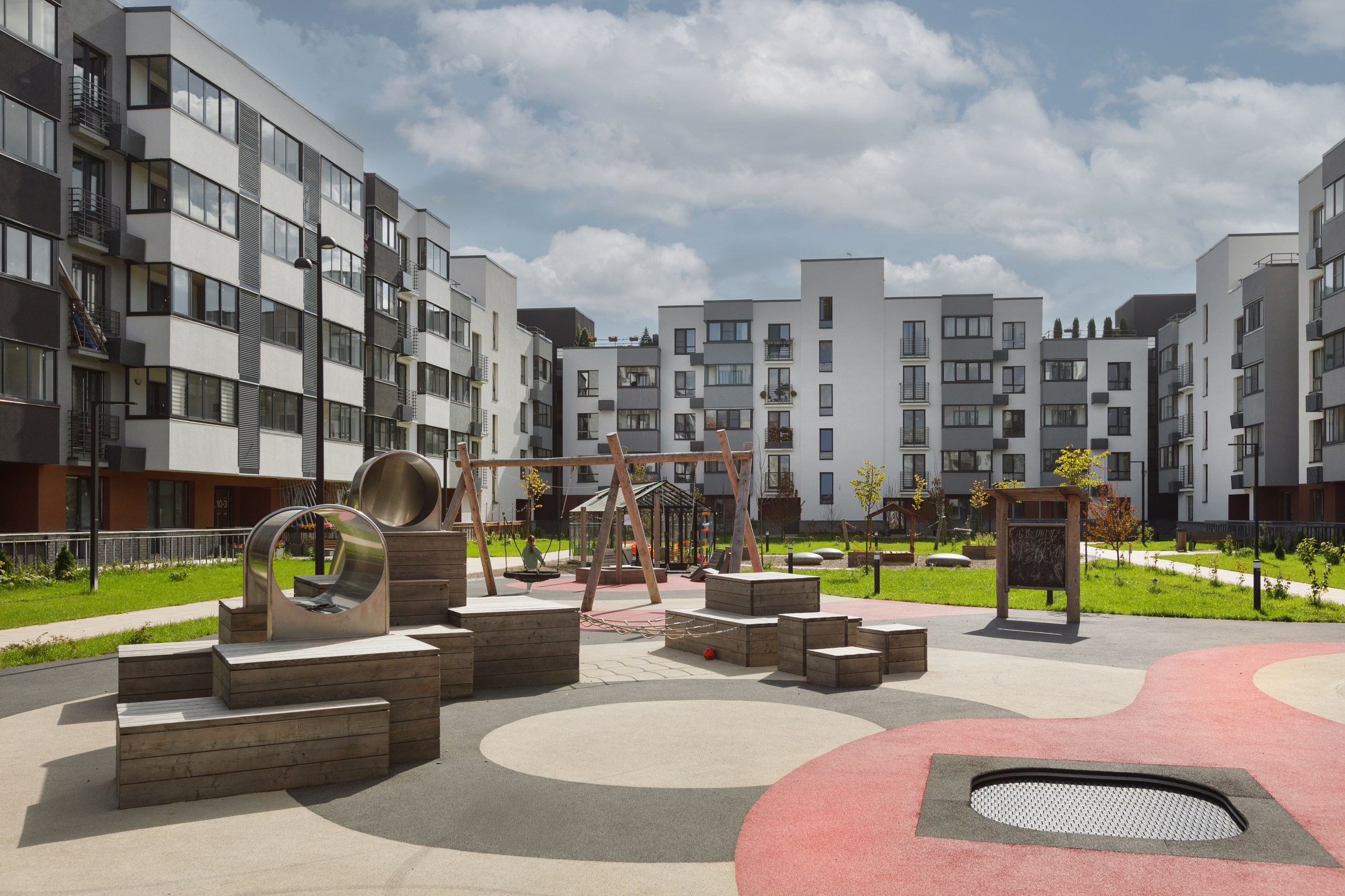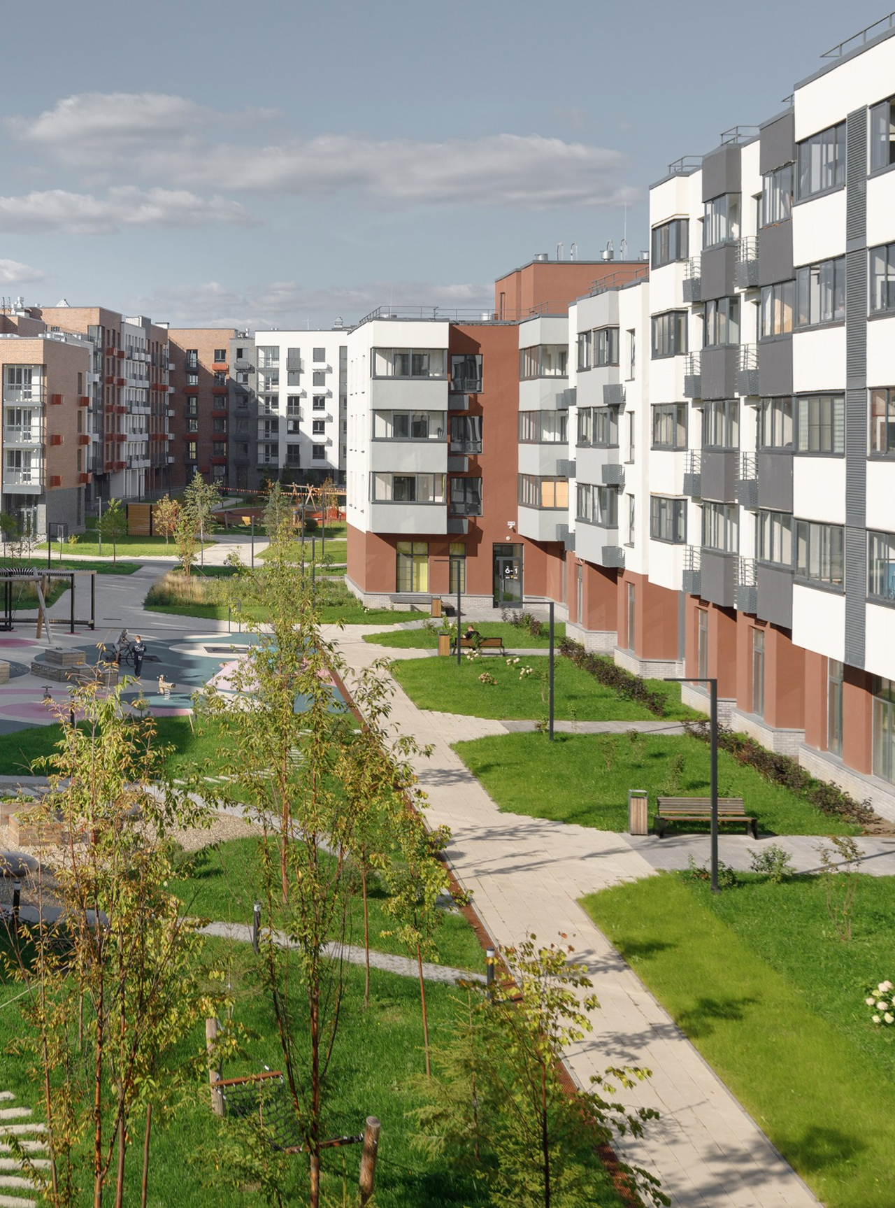 В центральной части квартала есть локальные места для отдыха — перголы с качелями, открытые поляны с шезлонгами, площади с разноуровневыми скамейками и сценой. Во дворах вместо парковки размещены детские площадки с разнообразным игровым оборудованием.