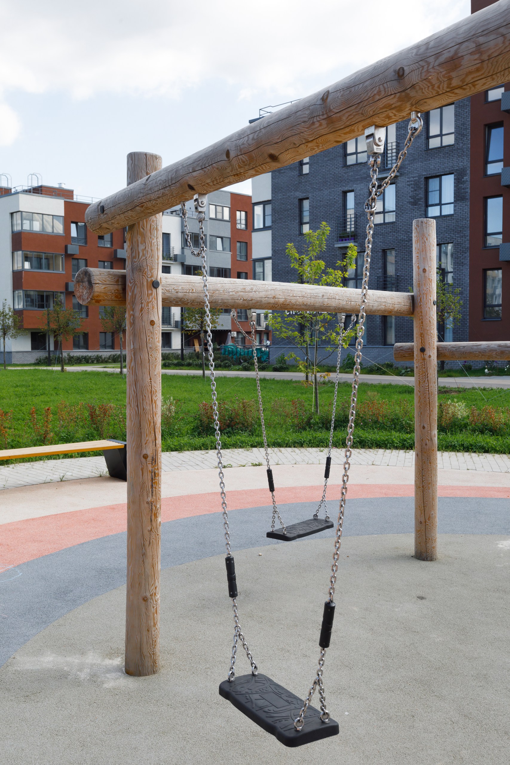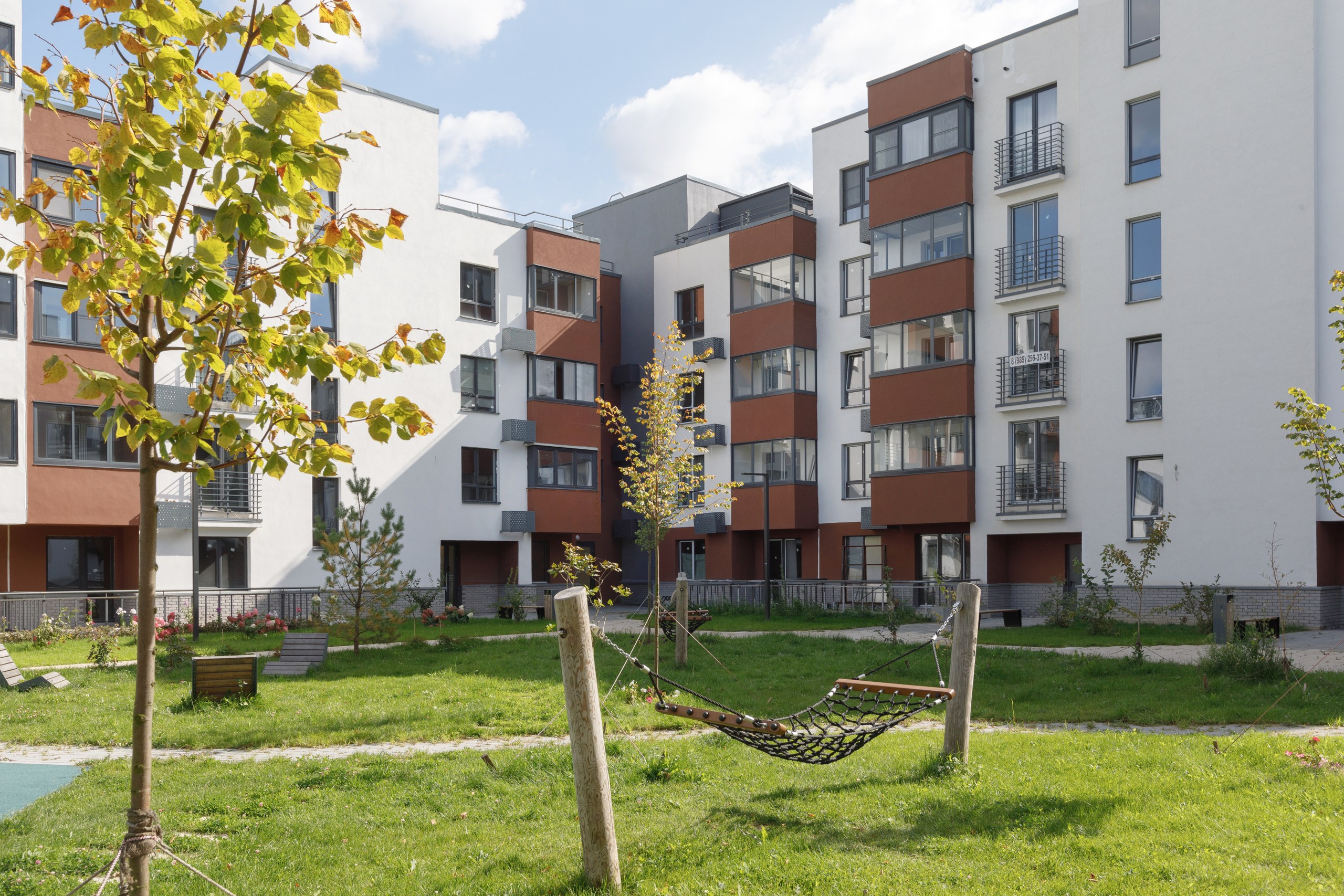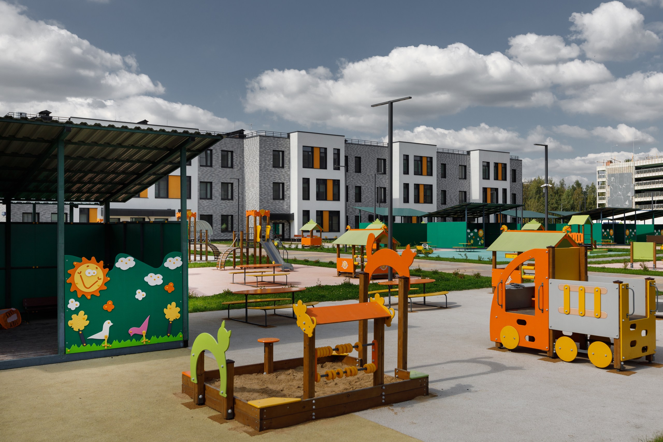 В центральной части квартала есть локальные места для отдыха — перголы с качелями, открытые поляны с шезлонгами, площади с разноуровневыми скамейками и сценой. Во дворах вместо парковки размещены детские площадки с разнообразным игровым оборудованием.