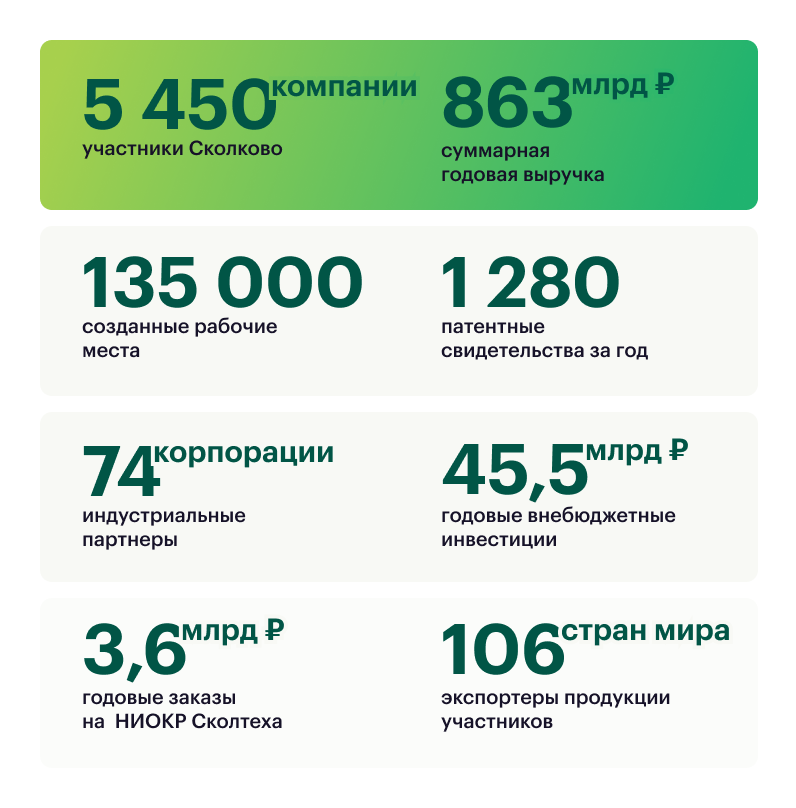 К своему 15-летнему рубежу экосистема «Сколково» насчитывает более 5 тыс. технологических компаний, которые суммарно обеспечивают свыше 130 тыс рабочих мест, и почти 80 крупнейших корпораций — индустриальных партнеров проекта. Более 100 участников «Сколково» достигли уровня годовой выручки свыше 1 млрд руб., 30 — свыше 2 млрд руб.