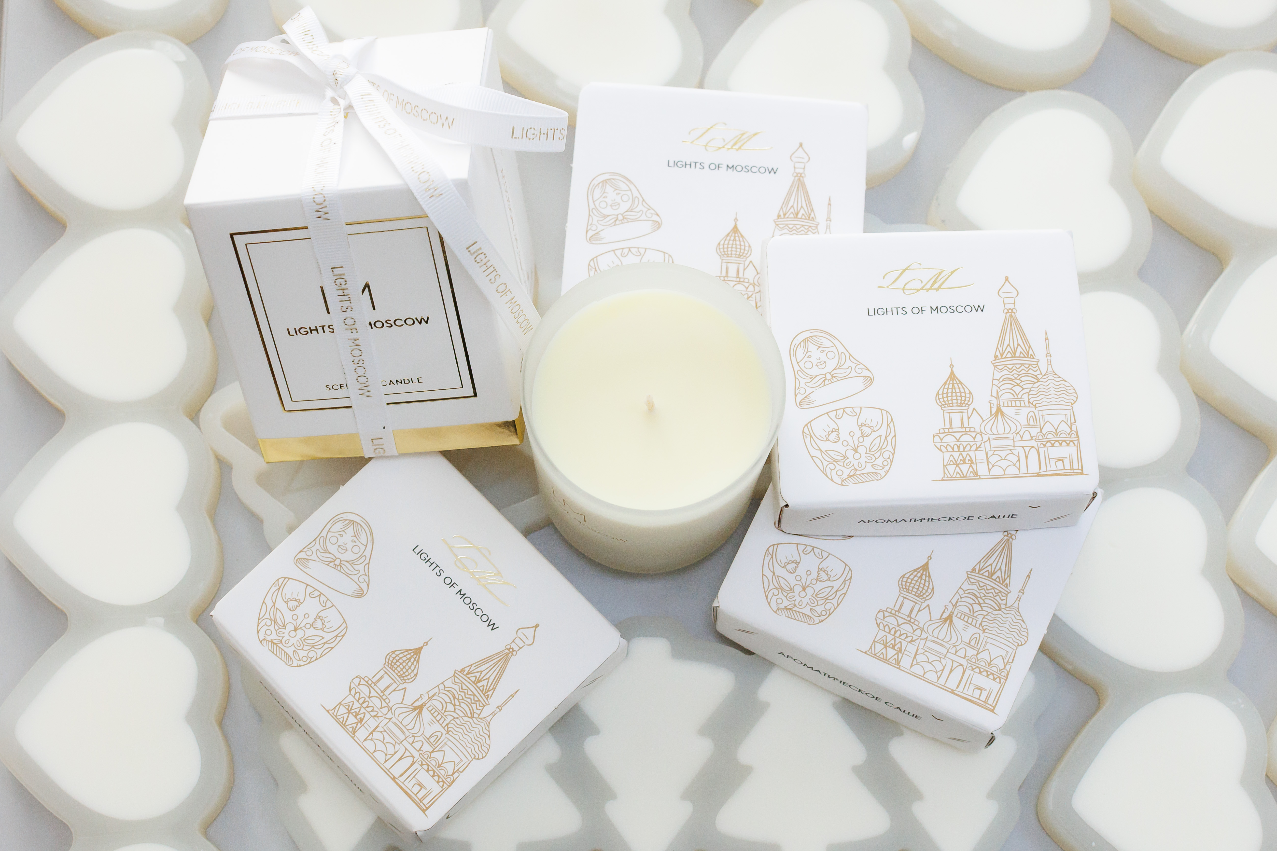 Light of Moscow разработал флагманскую коллекцию свечей и собственный брендинг: их фирменная белая коробка украшена золотым фольгированием, на ней изображен Храм Василия Блаженного — одна из главных достопримечательностей Москвы.