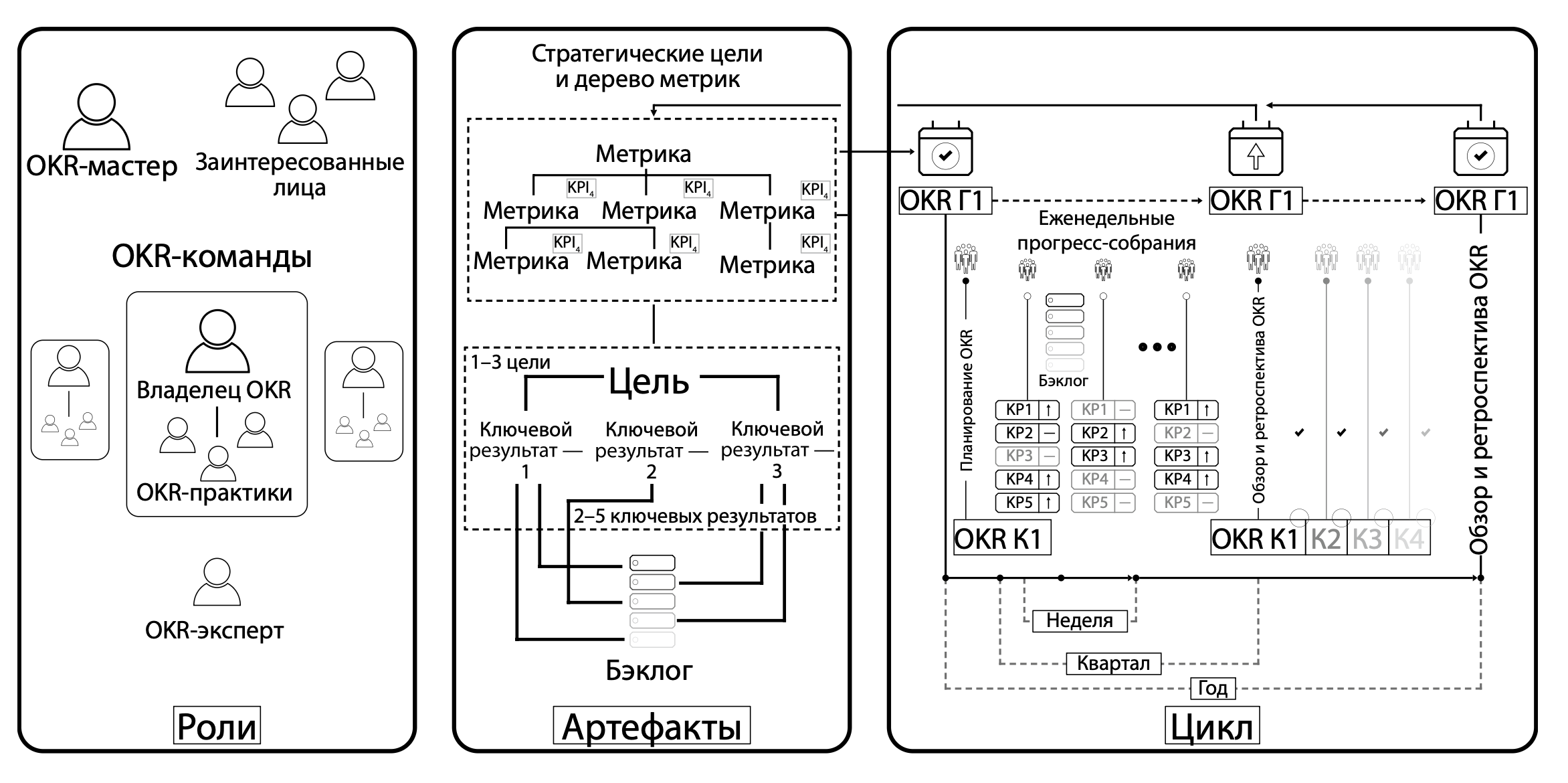 Существует целый ряд описаний схемы‑рамки. Мы будем опираться на вариант от OKR Russia, который мы несколько модифицировали и назвали «Большая карта OKR» (более крупная схематичная версия размещена в Приложении). С ее помощью проще показать все элементы, из которых состоит методика, и описать, что они собой представляют.