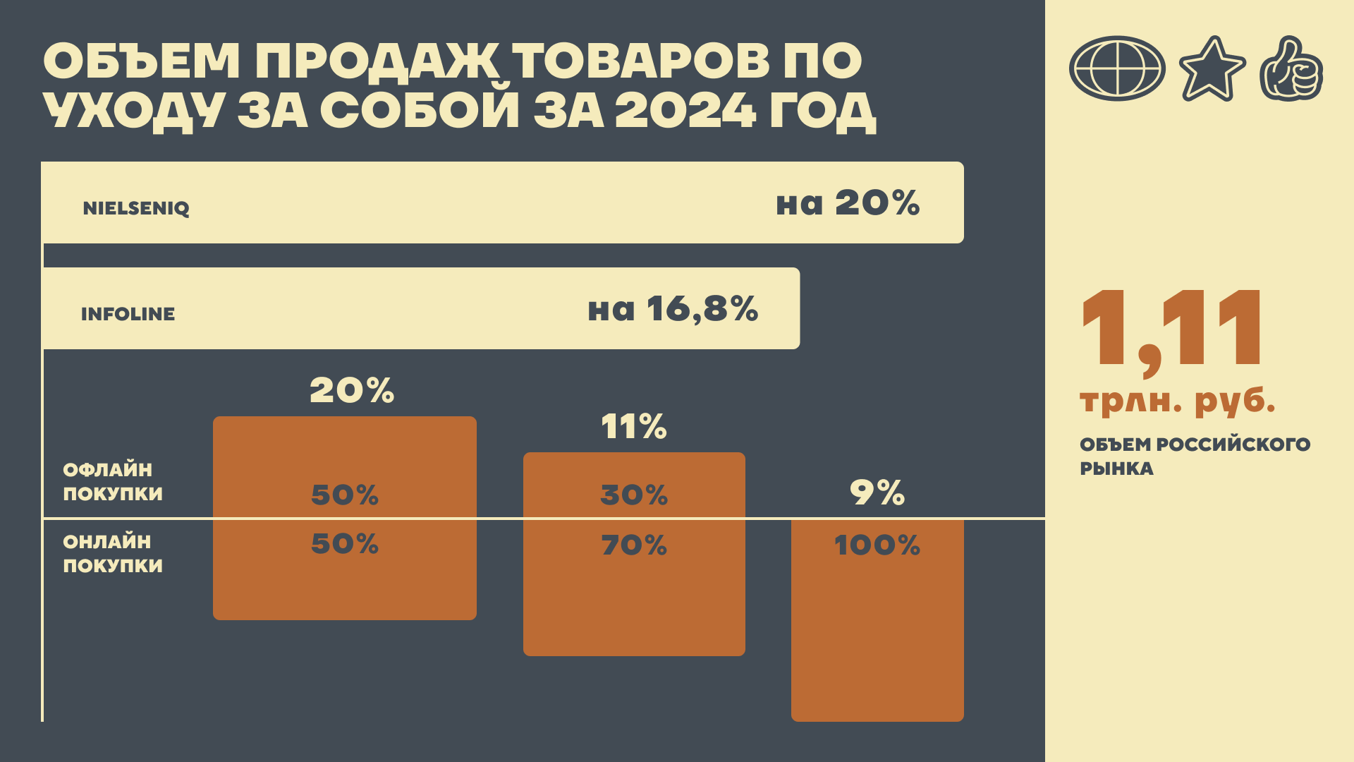 По данным NielsenIQ, в 2024 году объемы продаж товаров по уходу за собой увеличились в среднем на 20%. Похожие цифры приводит INFOLine: продажи косметики, парфюмерии и товаров для ухода за телом выросли на 16,8%, а объем российского рынка составил 1,11 трлн руб.
