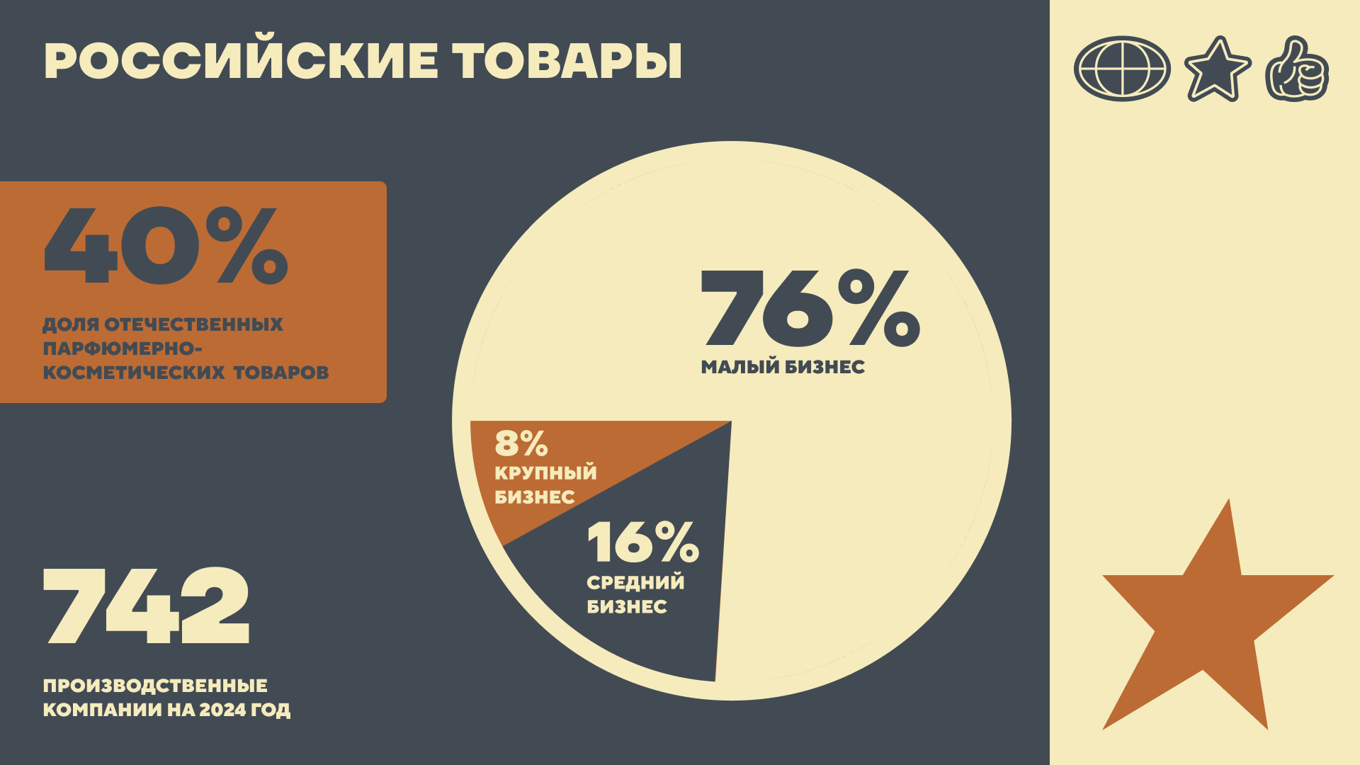 Как говорит Анна Дычева-Смирнова, сейчас на российском рынке доля отечественных парфюмерно-косметических товаров превысила 40%. На 2024 год в отрасли работали 742 производственные компании: 76% — это малый бизнес, 16% — средний и 8%— крупные компании.