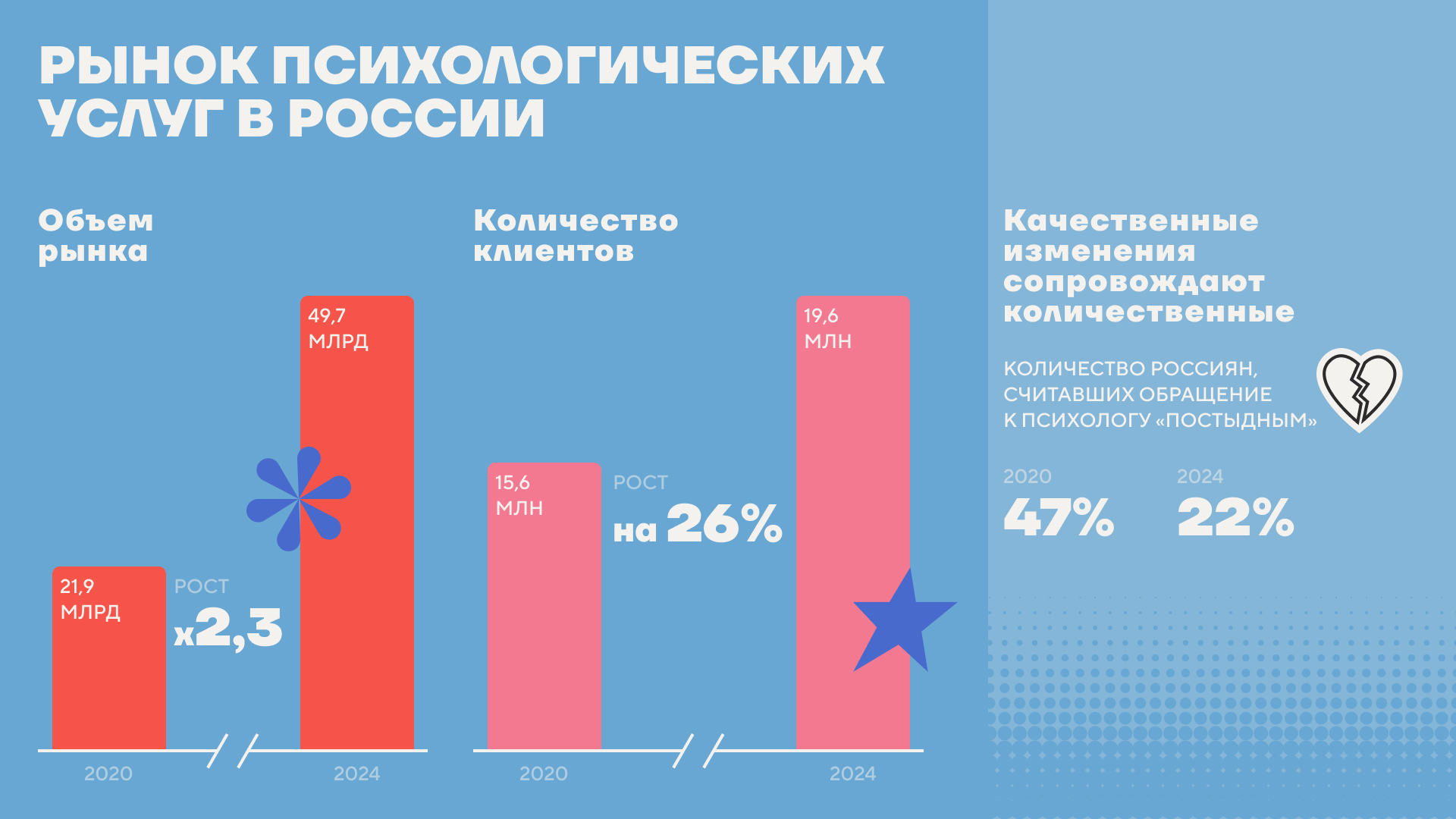 Рынок психологических услуг в России бурно растет. С 2020 по 2024 год его объем увеличился более чем в два раза — с 21,9 млрд руб. до 49,7 млрд руб. Количество клиентов за это время выросло на 26% — с 15,6 млн до 19,6 млн человек. Качественные изменения сопровождают количественные. Согласно ВЦИОМ, если в 2020 году 47% россиян считали обращение к психологу «постыдным», то в 2024 году таких осталось лишь 22%.
