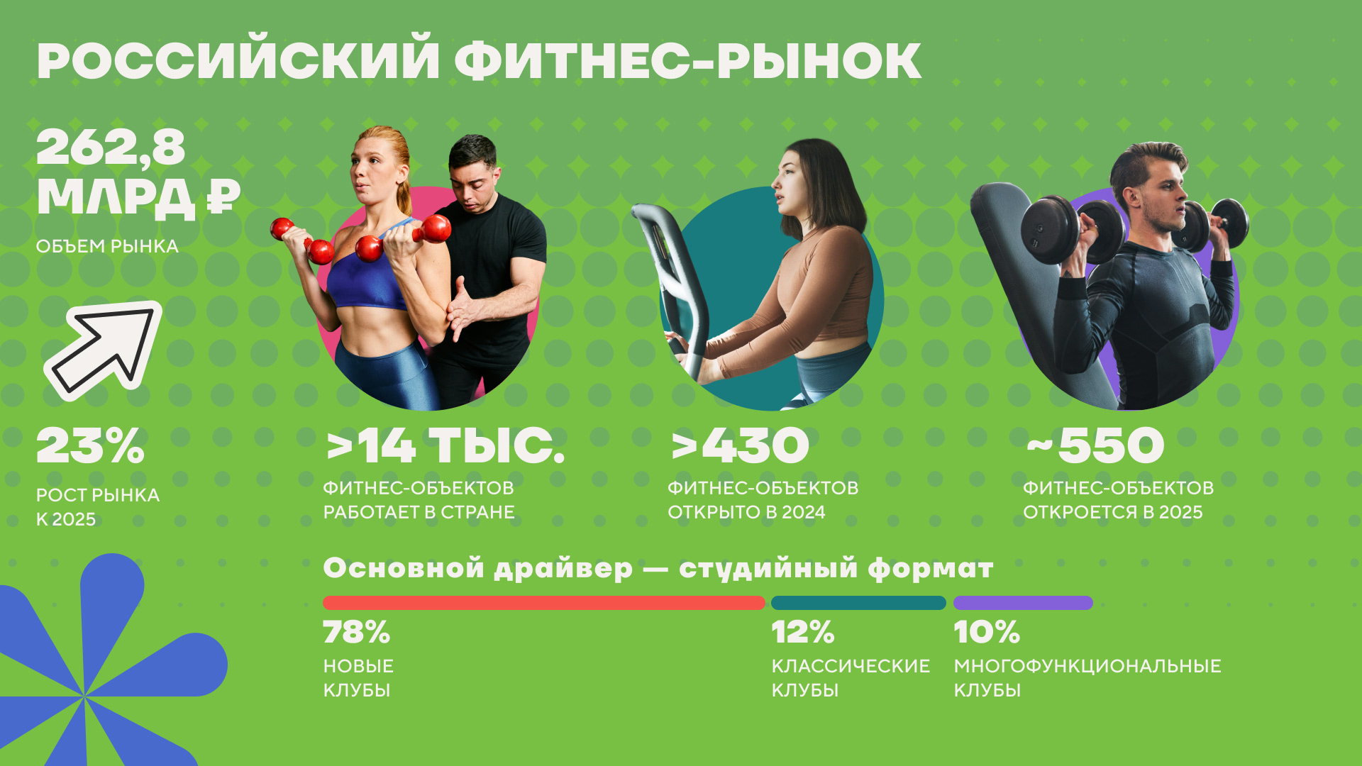В 2024 году объем российского фитнес-рынка достиг 262,8 млрд руб., показав рост на 23% (+49 млрд руб.). В стране работает свыше 14 тыс. фитнес-объектов, за год открыто более 430 новых, а в 2025 году ожидается ещё около 550. Основной драйвер — студийный формат: 78% новых клубов против 12% классических и 10% многофункциональных.