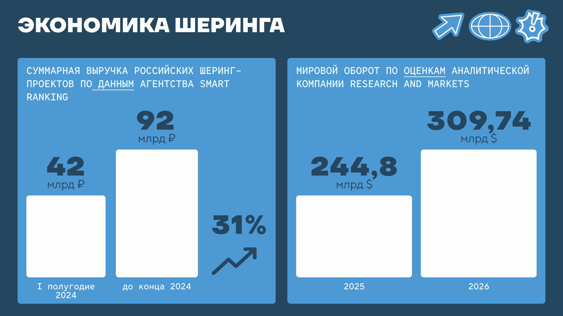 В России этот сегмент также не отстает. Суммарная выручка российских шеринг-проектов в 2024 году могла увеличиться, по данным агентства Smart Ranking, на 31% год к году.